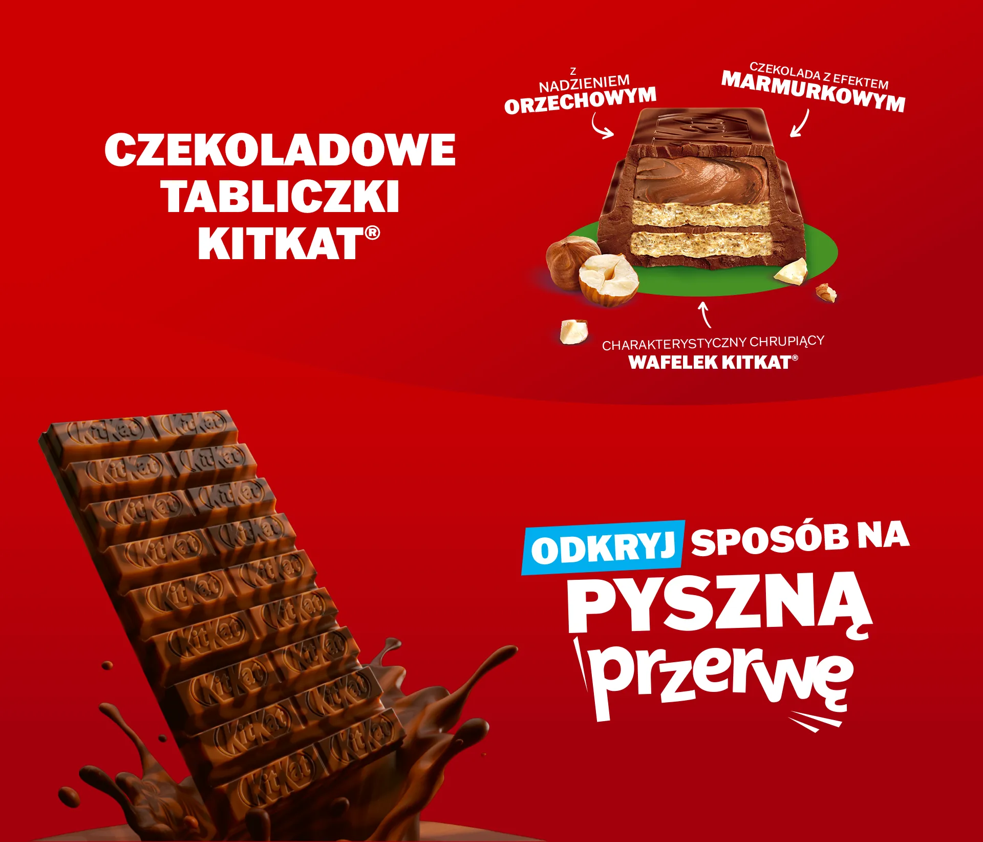 Charakterystyczny chrupiący wafelek KITKAT, wypełniony orzechowym nadzieniem, pokryty grubą warstwą mlecznej i deserowej czekolady z efektem marblingu (marmurkowej czekolady). Teraz w formie tabliczek. Odkryj nowy, pyszny sposób na przerwę. Odpręż się, a następnie otwórz, połam, i ciesz się satysfakcjonującym rytuałem. Zachwyć zmysły nowym doświadczeniem KitKat — teraz w formacie tabliczek, idealnym do dzielenia się!